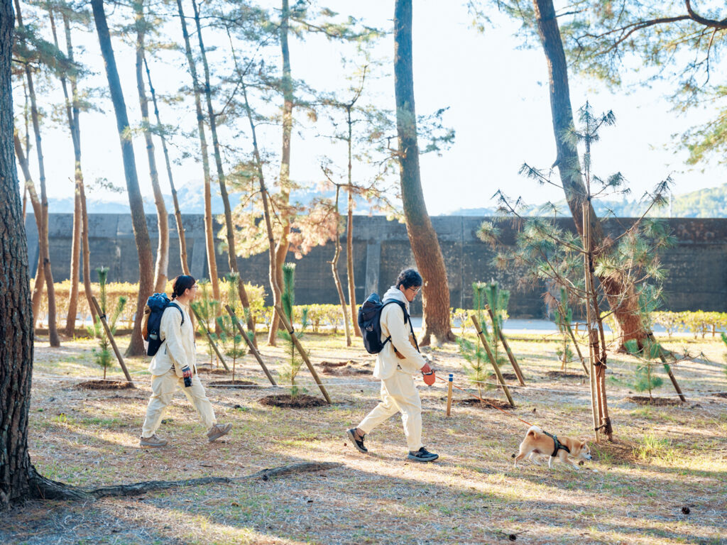 The Takahashis are kind enough to give us a guided tour around their neck of the woods to experience the outdoor lifestyle up close. We park the car at Tanezakisenmatsu Park and hike along the coast of Urado Bay. The area features a pine forest planted during the feudal era and a campsite where foreign pilgrims are camping.