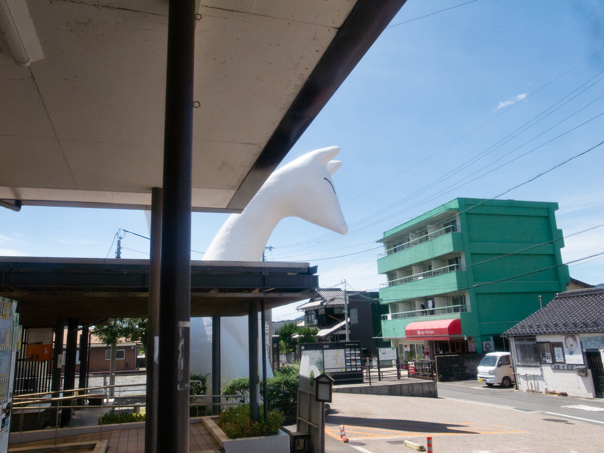 Step through the unstaffed ticket gate and out of the station, and you’ll spot it immediately on your left—a towering statue of a white fox.