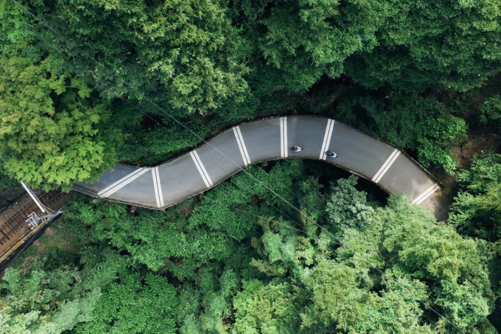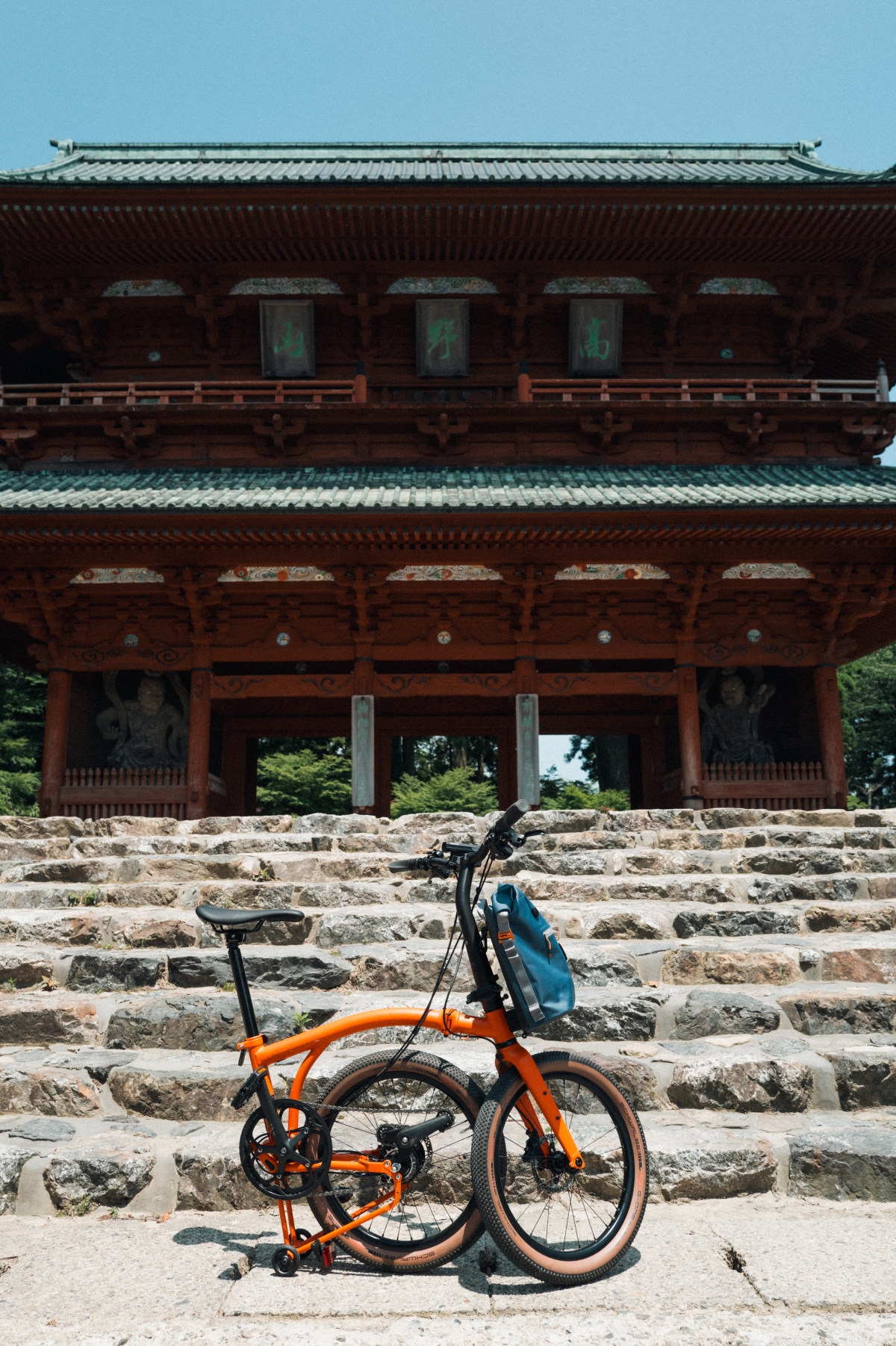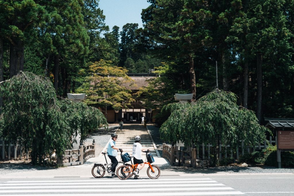 The Koyasan pilgrimage route makes the perfect hill climb from the foot to the top of the mountain through a UNESCO World Heritage Site. On the weekend, plenty of road bikes can be seen climbing the steep pass. But for our trip with Brompton, we opt for a fun ride that goes halfway up the mountain by train. From Shin-Osaka, go to Nankai Namba Station and transfer to the Nankai Koya Line, or via Wakayama Station, take the JR Wakayama Line to Hashimoto Station and transfer to the Nankai Koya Line, and head to Gokurakubashi Station for access to Koyasan.