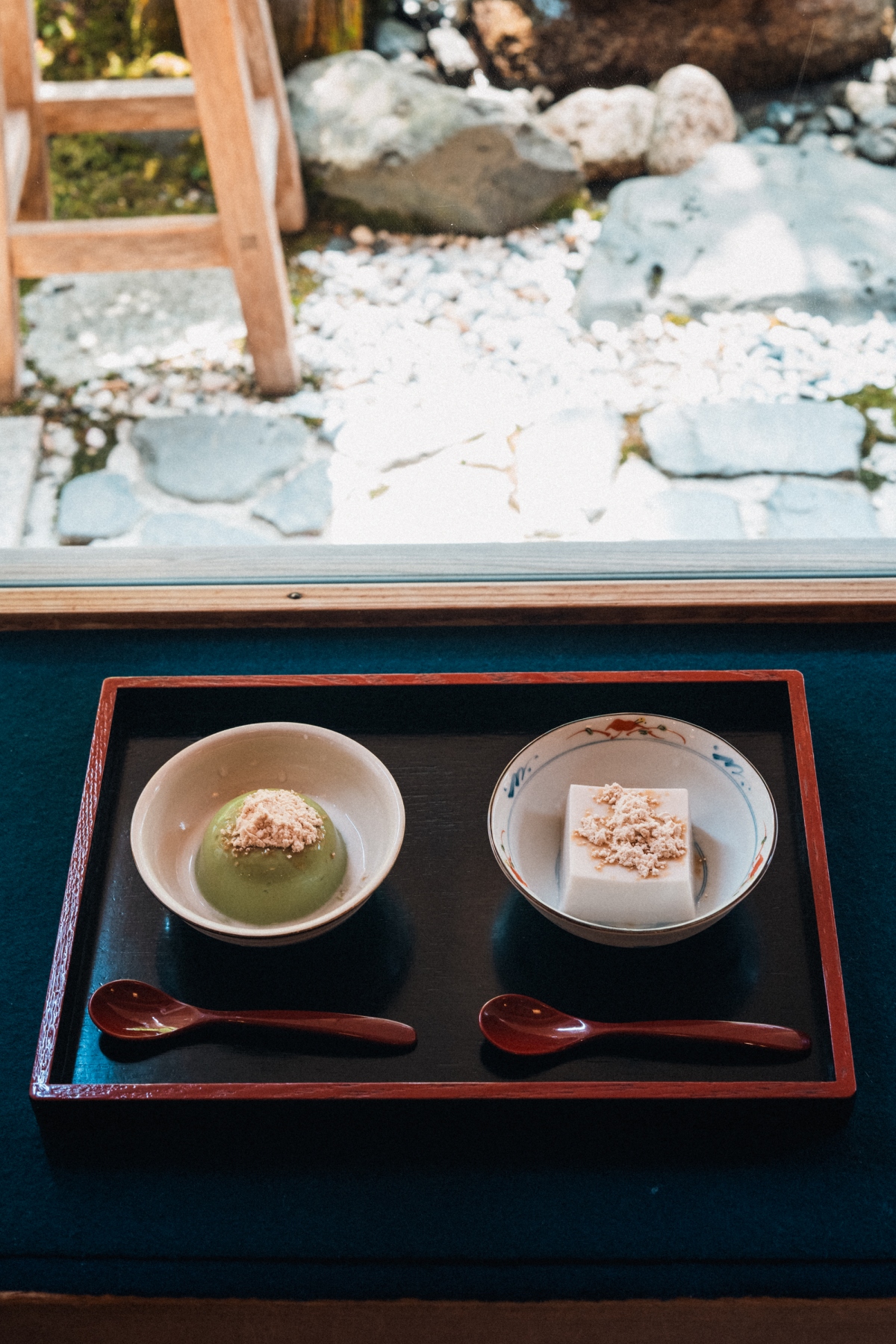 At the top of the mountain, priests in vivid yellow robes come and go between Buddhist sites such as Okunoin, Danjo Garan, and Kongobuji. The very atmosphere is sacred. Before exploring the grounds, we make a stop at Hamadaya, founded around 1897 (Meiji 30), for a short break over goma-dofu (sesame tofu) made only with 100% pure kudzu starch, white sesame seeds, and well water. After paying our respects at Kongobuji, we pass by the symbolic gate Daimon and head straight down National Route 480.