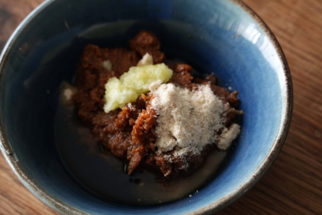 3. When the kakke is cooked, serve with garlic miso sauce.