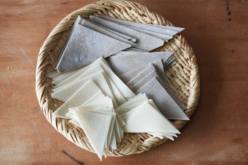 I discovered these thin square sheets of dough called kakke, made from either wheat flour (mugi) or buckwheat flour (soba), in a grocery store in Iwate Prefecture. The Ninohe and Kunohe areas of northern Iwate, close to the prefectural border with Aomori, are extremely cold in the winter. Being unsuitable for growing rice, a culture flourished of consuming grains like buckwheat and wheat. Kakke was created against this backdrop. The buckwheat or wheat flour dough is rolled thin and cut into triangles, then boiled and enjoyed with garlic miso. There are various theories about the origin of the name. One common story says kakke comes from kakera, referring to the shreds or scraps of buckwheat dough left over from making soba noodles. Another says it comes from kah-keh, the dialect for “enjoy your meal.”