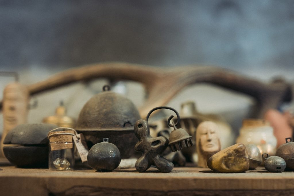 We were in Kumiko’s small workshop talking about her bells and the numerous collected objects filling almost every surface and corner of the room. In and among her own creations were artefacts made by friends and others treasures found when travelling: Bell themed wood carvings, bells threaded like shell necklaces, small silver whistles and of course bells and more bells in varying shapes and sizes.