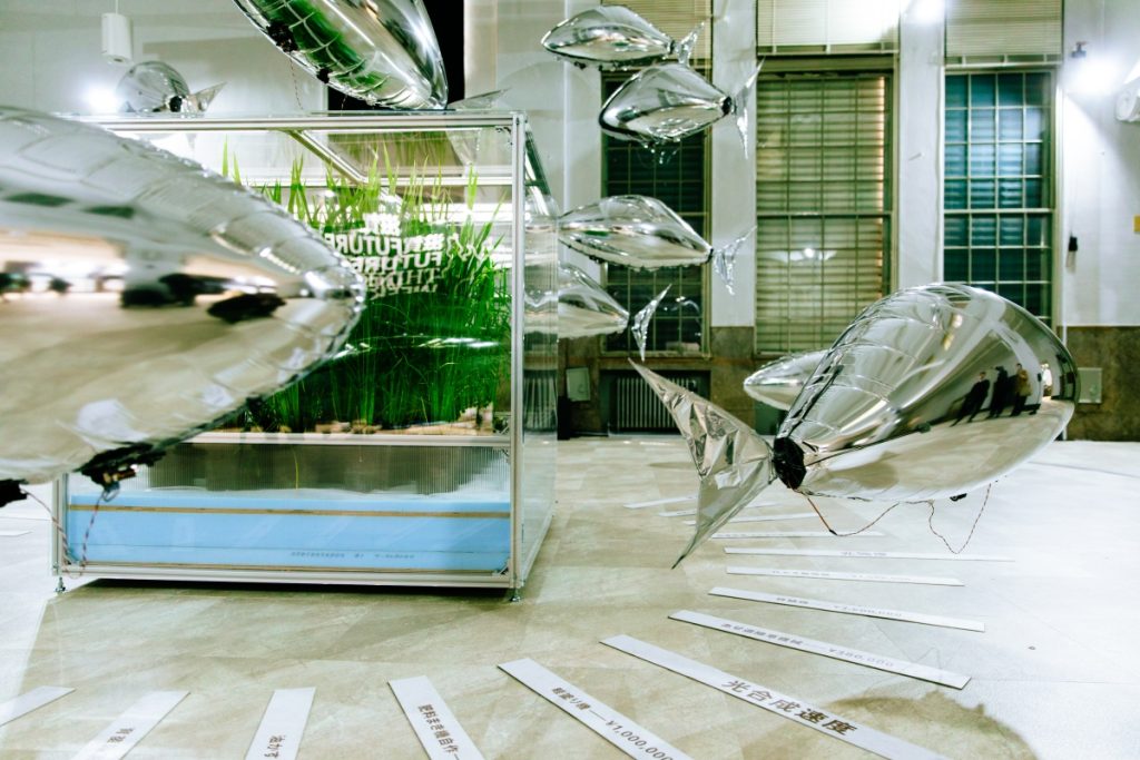 Upon entering the venue, one’s eyes are first drawn to a school of large fish floating and moving about in midair. The installation named Flock Of is the work of Thailand’s creative technology group bit.studio. Each balloon is fitted with a small computer and sensors so that the fish detect each other and objects in their surrounding environment, and affect one another as they navigate the space not automatically but autonomously.