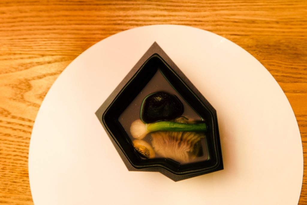 The course began with a tasting of two different waters, from the farthest upstream and the farthest downstream from Lake Biwa. Each course was served with a slip of paper indicating the nitrogen level, transparency, and other properties of the water used in the dish, in Hare and Ke (special and ordinary) bowls with charts showing happiness levels.