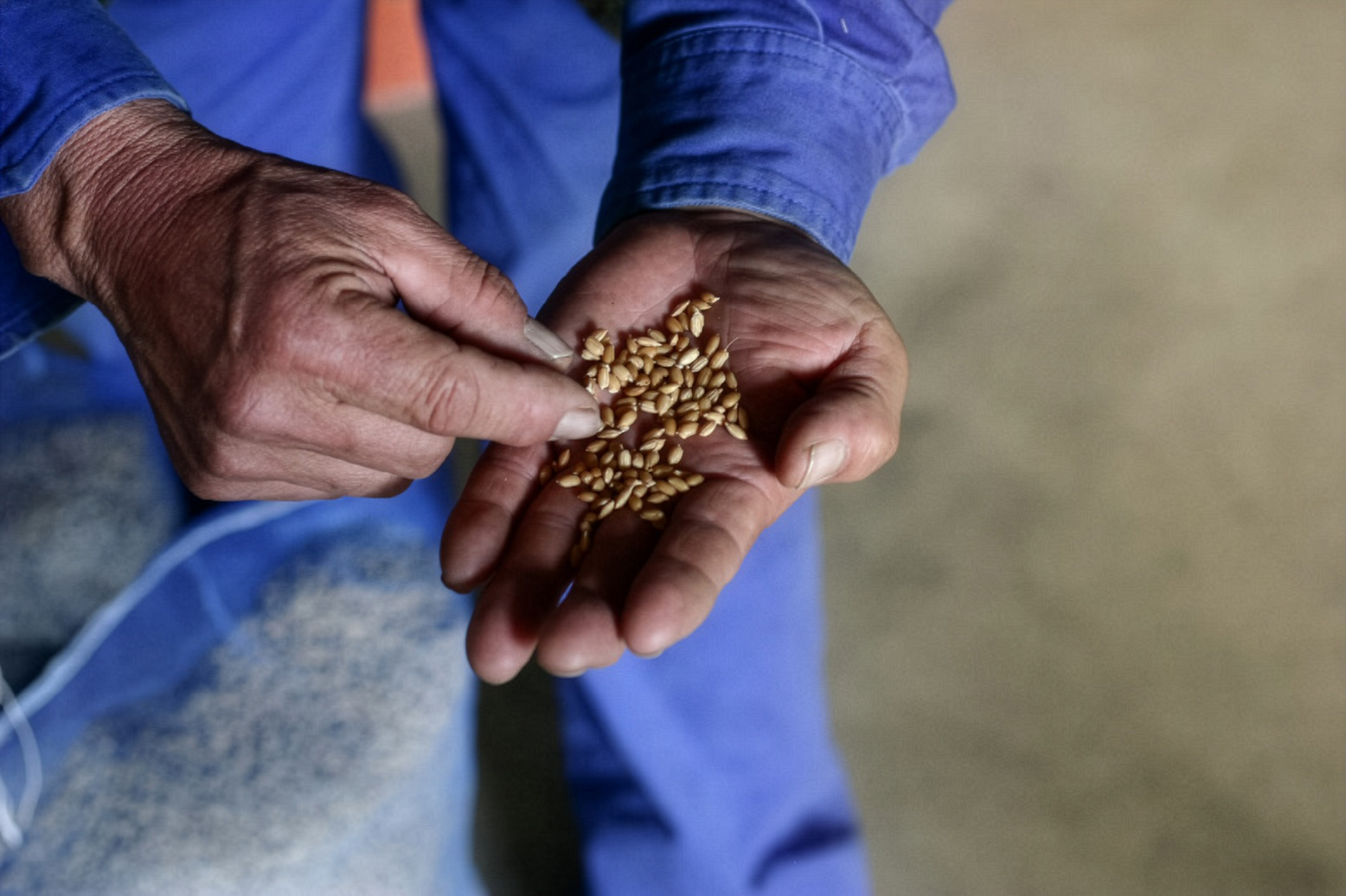 Part of the slight revolution in Kozaki is a slight reversal of the urban migration going on elsewhere in Japan, people are moving back in to Kozaki to create change with good food as the catalyst. Kazushi’s farm is supporting a whole ecology of these producers — from the natural Sake of brewery Terada Honke, to a nearby tofu factory. After talking, we ask him to show us his farm, but nothing has been planted yet, and the fields are untilled and bare. Instead he shows us the rice seeds he is about to plant, by ripping open a mesh bag and gently taking up a handful. He is looking for something as he rolls the seeds slowly across his palm, moving each seed back and forth and folding up his wrinkled face as he squints to look closely at the seeds. “There,” he says. And we look, and see a tiny stem, light and insignificant.