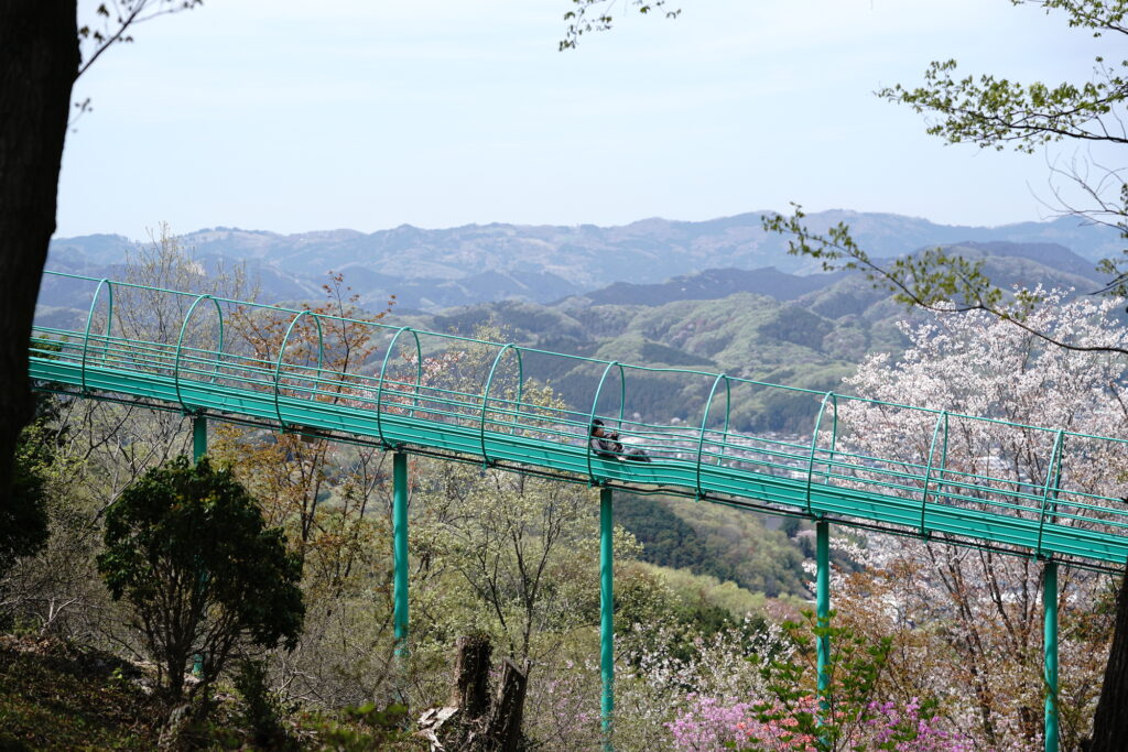 Our first stop was Sengenyama Miharashi-no-Oka Park. We parked our bikes and huffed and puffed our way up the mountain path on foot. From the observatory at the summit, we got a sweeping view of the town of Ogawa that we were about to explore. We also enjoyed the treat of a big roller slide—the favorite attraction of Editor in Chief Lucas B.B.