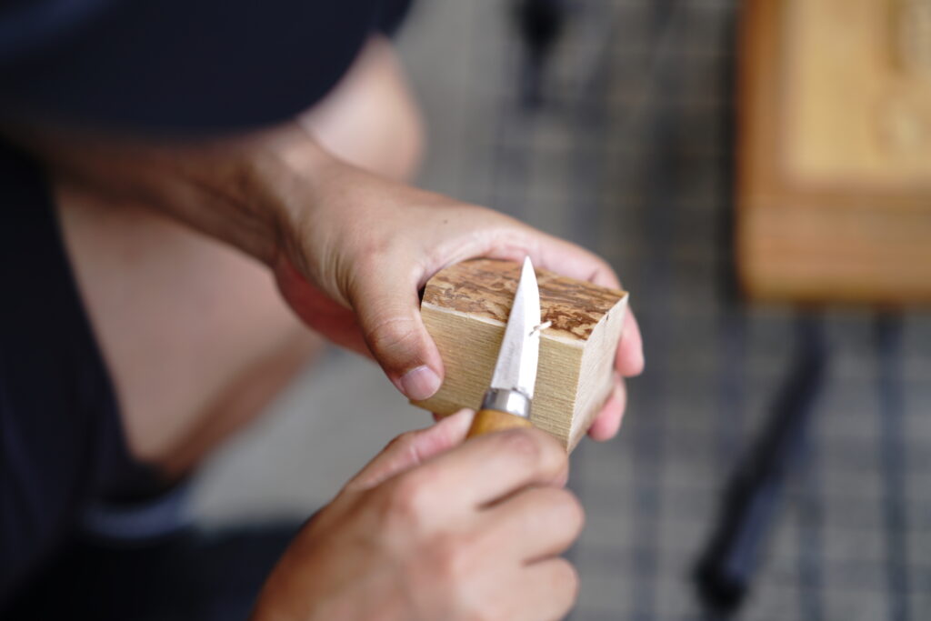 Having quelled our hunger, we headed for the lifestyle and outdoor shop GRID, where the owner, Tatsuya Aoki, instructed us in the art of making a single-flower vase. Tokigawa boasts a strong industry in tategu—latticework partitions such as doors, screens, and shutters. The process of making those fittings produces wood waste of all shapes and sizes. We chose our favorite pieces of wood and began carving. Our tool of choice here was the MORAKNIV knife. We glided the blade along the grain to carve out the perfect shape, and then applied a coat of beeswax to bring our work to completion. What pieces of art did we create? Several participants picked some wild flowers growing in the grass by the road, made a flower arrangement, and admired their work. Some wanted to do even more carving, but alas, we were only halfway through the day’s ride.