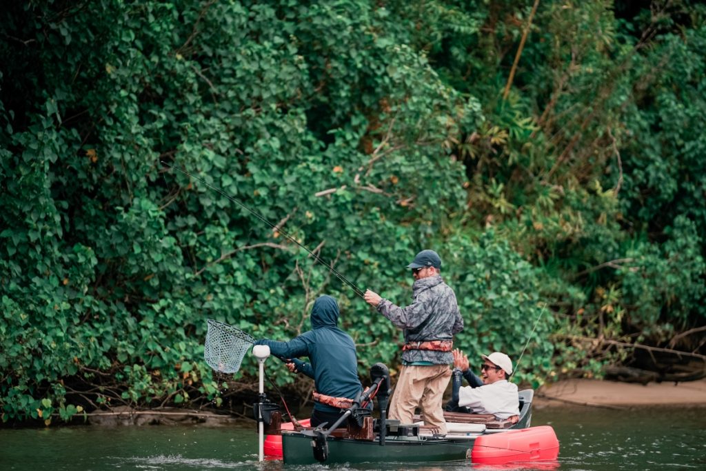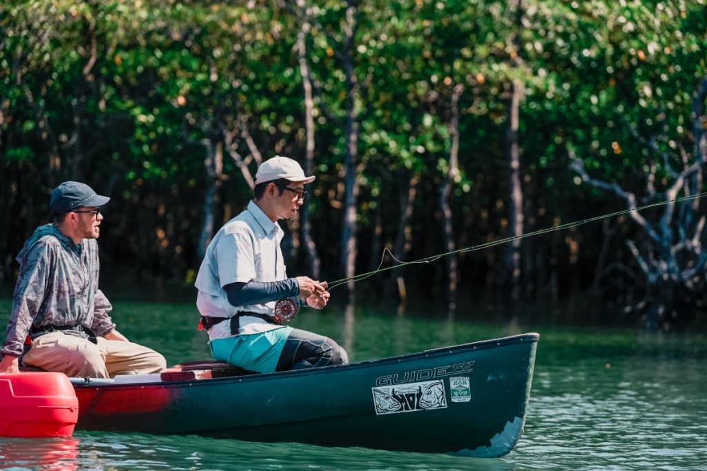 カヌーから10 m先にポッパー(浮くタイプのフライ)を投げると、着水と同時に水面が炸裂。元気なマングローブジャックが食いついてくれた。水中に赤い魚体が戻っていく姿を見送りながら、ふとこの自然豊かな島のエコシステムに想いを馳せた。