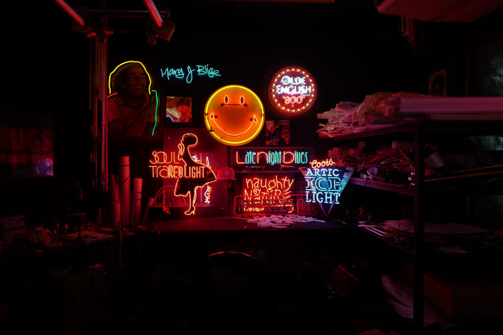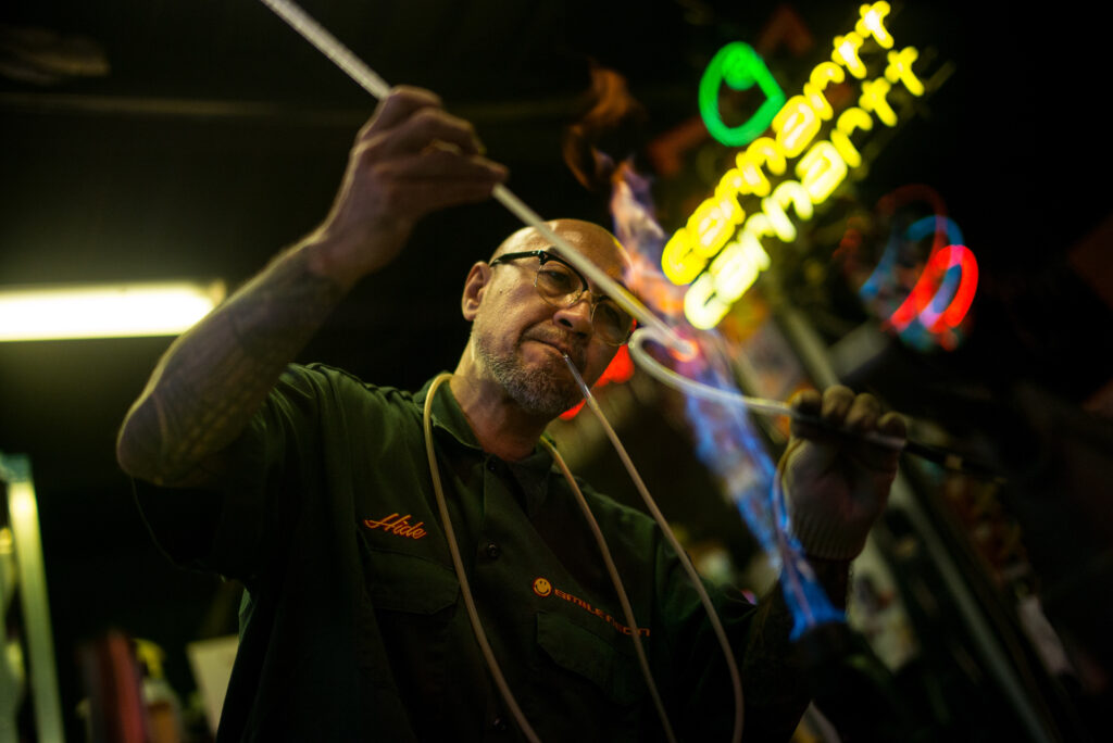 若い頃、高橋さんは生まれ育った横浜、本牧の街を華やかに灯しはじめたネオンサインの輝きに魅せられた。20歳になった高橋さんは、蒲田のネオン工房に弟子入りし、12年間修行を積んだのちに独立、「Smile Neon」を創業した。現在も伝統的な技法を守りながら、新たな技術を開発している。