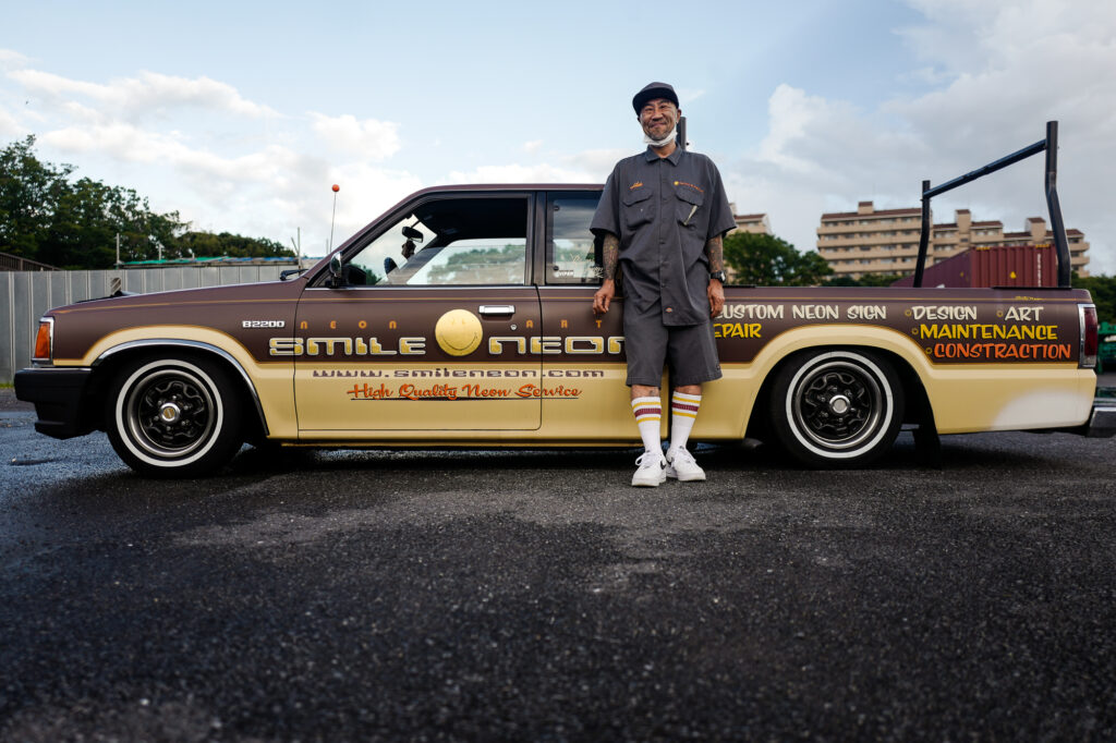 この工房は、高橋さんのデザインするネオンの美学がそのまま反映されている場所なのだ。彼の一番の自慢アイテムは、ローライダー仕様にカスタマイズした仕事用のピックアップトラックだ。