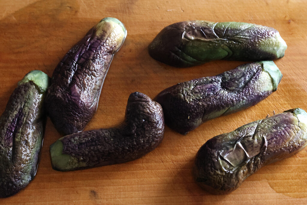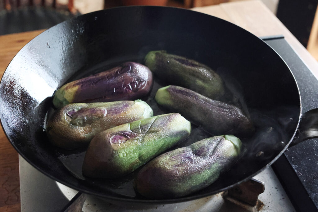 1. フライパンに水と油を入れておく。茄子はヘタを除きたて半分にカットしたら、すぐフライパンに入れる(アクで変色するのを防ぐため)強火で加熱して蓋をし5分ほどたったら裏返し、水分がなくなったら火をとめ、そのまま2〜3分おいて火を通す(串などを刺してすっと通ったらOK)。