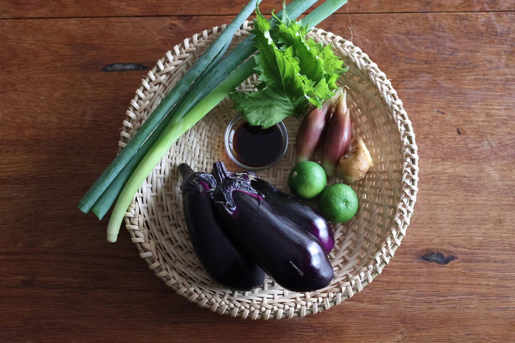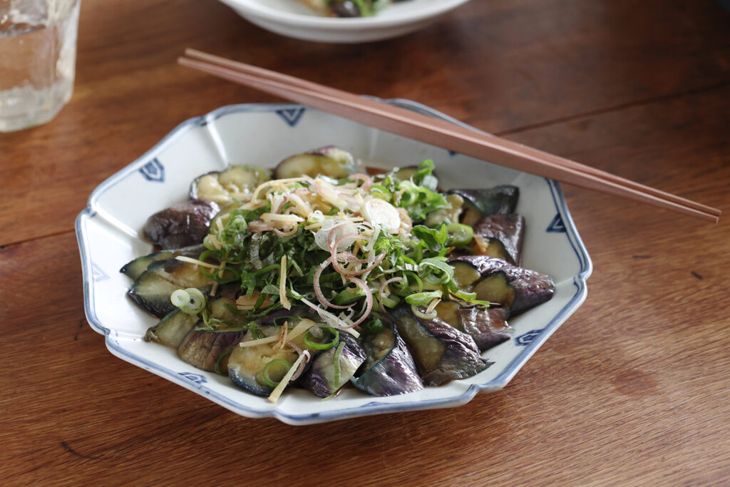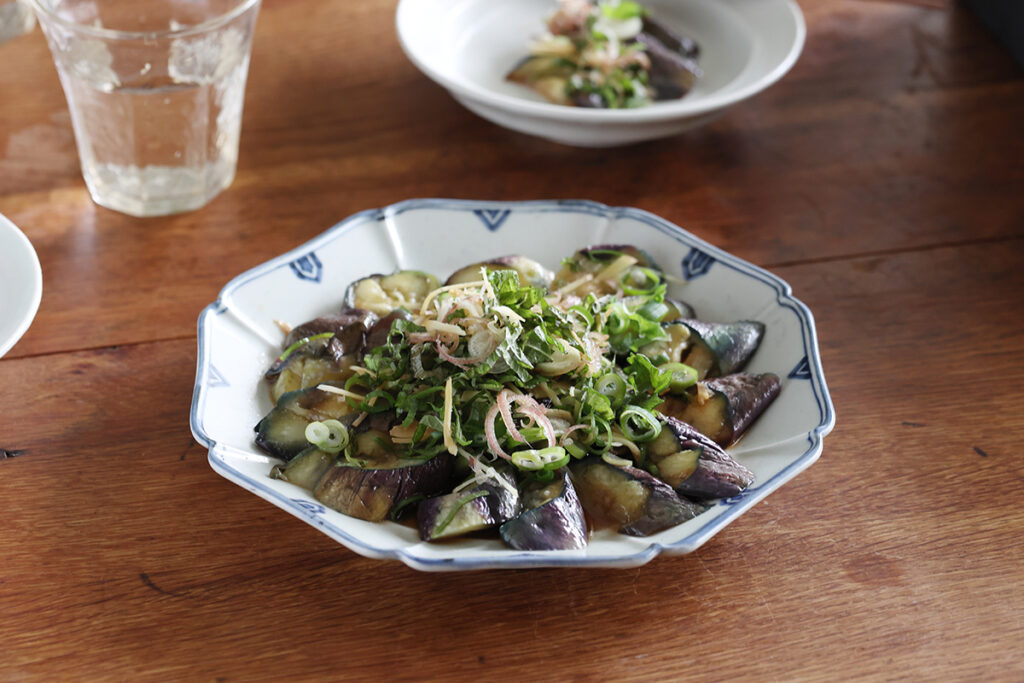 名産地で生まれた「なすのたたき」は、加熱した茄子をスライスして上にたっぷりの薬味をのせ、ぽん酢醤油をかけたもので、作り方は色々あるようです。茄子を揚げたり、蒸したり、薬味は茗荷、紫蘇などの他、玉ねぎを乗せたり、シーチキンをのせることも。今回は、茄子を蒸し煮した水に少しだけオイルを入れて、揚げた茄子より軽やかに、蒸した茄子よりコクある茄子に仕上げました。たたきの材料は、茄子をはじめ、茗荷、ポン酢醤油に使う柚子も高知県の名産です。茄子のたたきは「まっこと、うまいき!」薬味はその時あるもので自由にお楽しみくださいね。