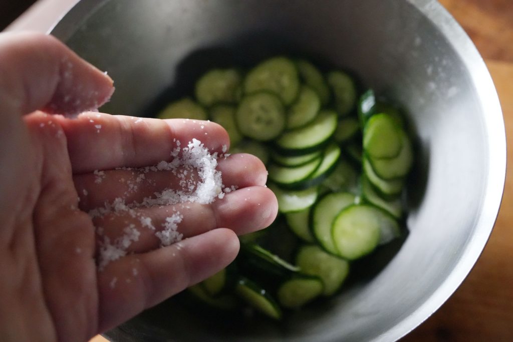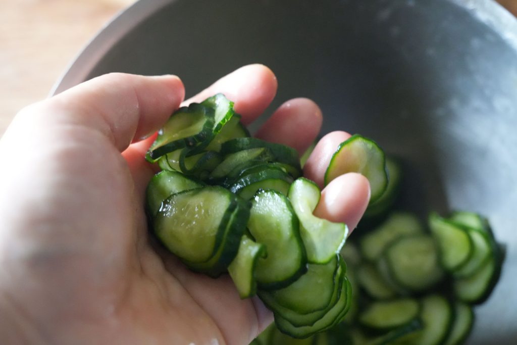 1. きゅうりは薄く輪切りにしてボウルに入れ塩をかけまぜ、10分ほどおきしんなりしたら、手でぎゅっと水分を切る。茗荷は薄切り、青紫蘇は千切りにする。