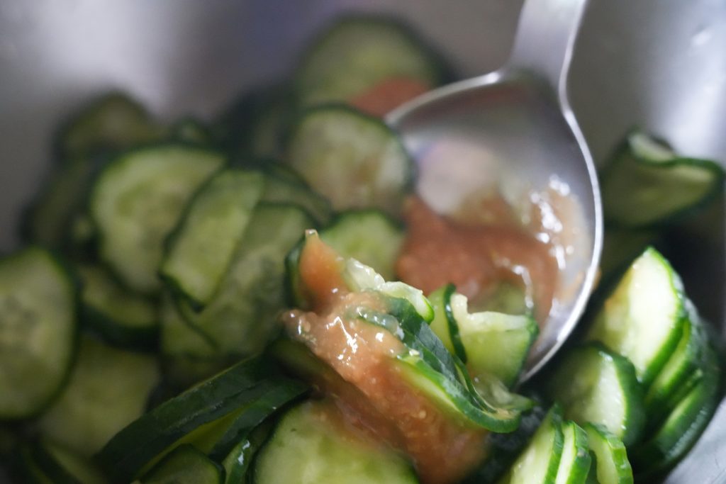 3. 味噌、砂糖、炒りごまを混ぜあわせき(1)のきゅうりを和え、青紫蘇、茗荷を混ぜる。