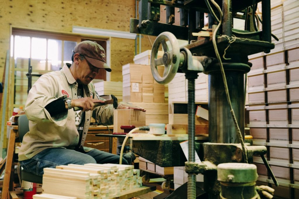 「地元で伐採されたスギ材から茶箱に適した材を選び、島田で製材したものを3ヶ月間、干して乾燥させ、ここで茶箱に仕立てています。防湿・防虫効果があることから現在は茶葉だけでなくコーヒー豆や米、乾物、カメラやカメラレンズの保管にも用いられているんですよ」(「前田工房」の薗田喜恵子さん)