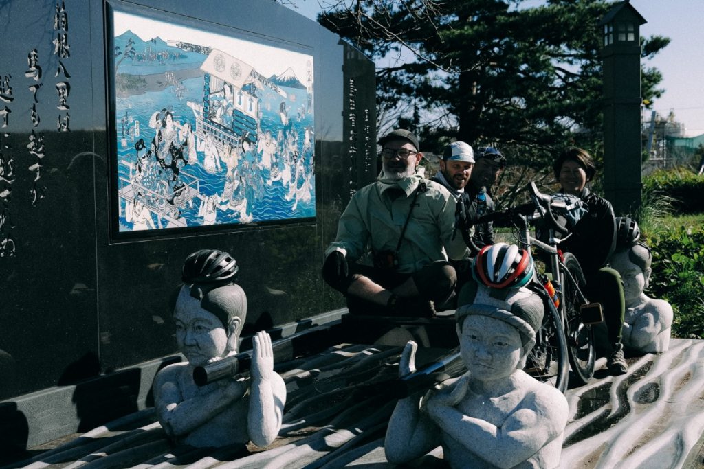 スタートは、ハイクのルートと同じ焼津市の石津浜公園。雪をかぶった冬の富士山がサイクリストたちを見送ってくれる。これは幸先がよさそう!那閉神社に立ち寄り、旅の安全を祈願してカツオつながりの大漁守りを買い求め、瀬戸川沿いを進む。旧東海道の一部をなぞり、宿場町の佇まいが残る岡部宿から朝比奈方面へ。