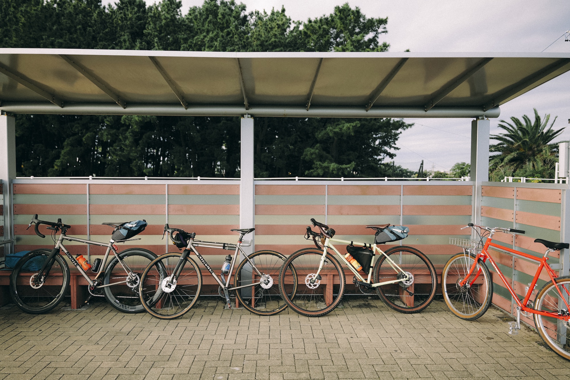 レース仕様のチタンフレームのバイクから太めのタイヤを履かせたグラベルスタイルまで、思い思いの自転車が聖揃い