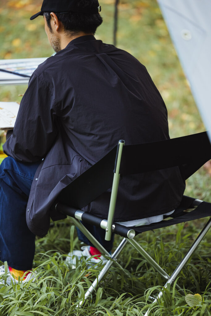 muraco初となるチェア。折りたたみ式で収納はコンパクト。ナイロンウェビングを採用した座面と背もたれは頑丈で、独自機構の背もたれは心地よさを追求し、着座位置も自由自在。ミニマルなデザインはアウトドアに限らず、インテリアやガーデンにも。