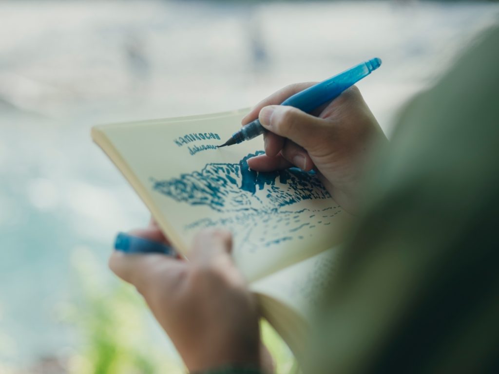 すばらしい陽光で起床。快晴だった。本日の目的地、岳沢へ向かう。登山道はウッドデッキの遊歩道とは違うワイルドな質感。スケッチ、休憩を挟みながら3時間ほどの岳沢への道のり。その途中で何度も足を止めさせられる絶景に出会ったが、高く登れば登るほどその美しさは増していくようだった。