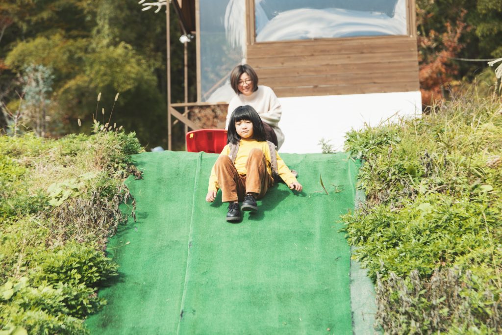 小高い丘のような立地に建つ、BESSの家。土地の傾斜を利用した滑り台でお子さんたちが楽しく遊ぶ。出迎えを受け、家に入るとほのかな木の香りが心地良い。早速、大阪市内から思い切って移住してきたというご夫妻の話に聞き入った。