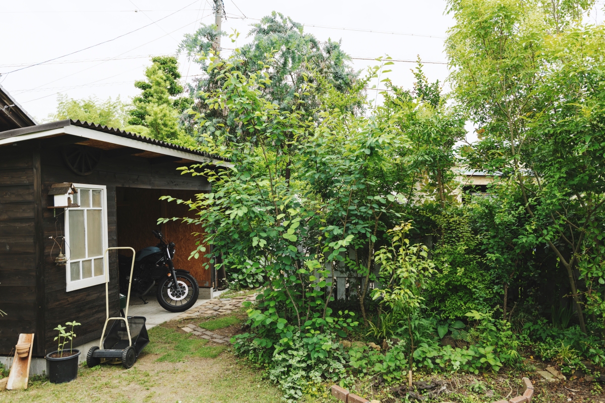 啓介 「もともと何かを作ることが好きで、BESSの家に住むようになってどんどん作りたいものの幅が広がっていますね。本棚も庭のバイク小屋も自分で作ったんですよ」