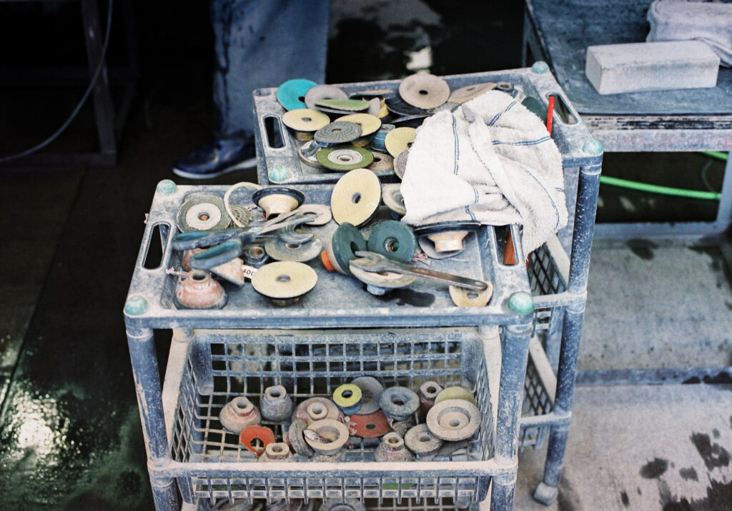 薄暗い作業場のなかには石の角材が所狭しと並び、奥にはふたりの職人が電動工具で石を削っていた。「昔は防塵マスクがなかったので、私たちは石の加工作業中に大量の粉塵を吸いこんでいました」と、竹林は電動式人工喉頭を使って語る。喉頭に悪性腫瘍ができたため、その部分を切除した。発癌性のある結晶質シリカを大量に吸いこんだのが原因だ。いま作業場の奥で働いている職人はマスクをしたうえで、作業中は石の上に水を流しっぱなしにして舞い上がる粉塵の量を最小限に抑えている。
