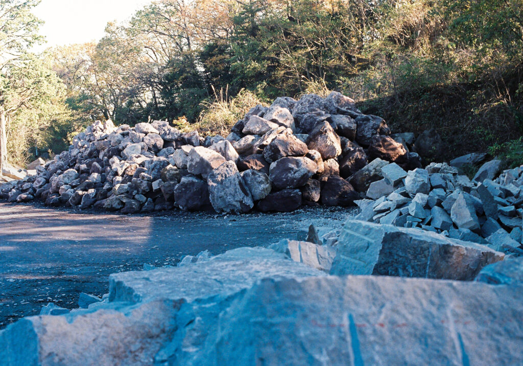 「これまで掘りだした良質な小松石のなかで、いちばん大きかった石は長さが8mもあった」と遠藤が教えてくれた。いまでは採掘法の安全性と効率は向上したものの、それほど大きな石にはなかなかめぐりあえない。ほとんどの石がすでに掘りだされているからだ。100年以上前は、海の近くの現場で石を採掘できたから、東京や日本のほかの港に運搬するのも簡単だった。このことが小松石の知名度を押しあげた。小松石のような石はほかになく、真鶴で大量に採掘できたうえ、流通が容易だったからである。いまでは大量に採掘できなくなったし、運搬にかかる手間も外国産のものと変わらなくなってしまった。小松石は貴重品になりつつある。採掘業者の3代目だが、次の代になっても小松石が残っているかどうかはわからないという。真鶴の下に眠る貴重な石の最後の塊が掘りだされる日が、いつかかならず訪れる。その石は切断され、磨かれ、やがて私たちの誰かがその斑点模様の青みがかった石の下に眠ることになるだろう。