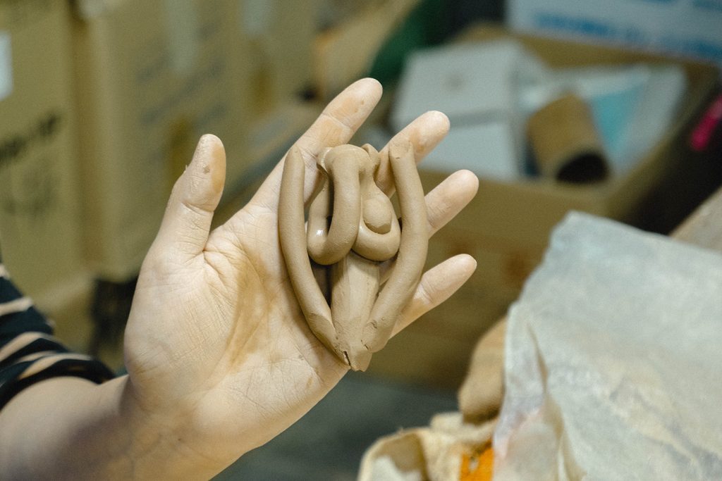 粘土の塊を指先でひねって成形していく。型を用いて量産しているのではない。一つひとつに個性的な表情は、この手びねりによって生み出される。